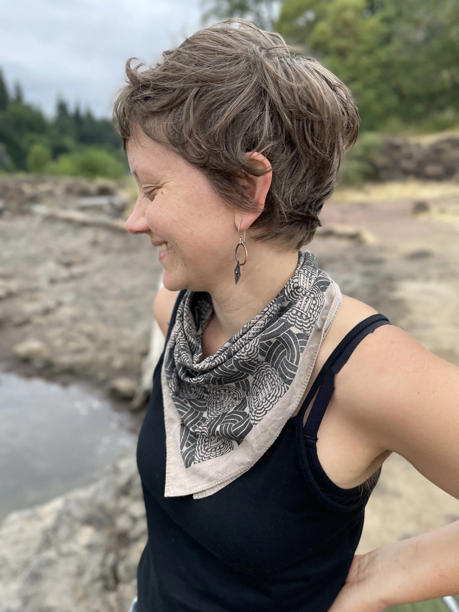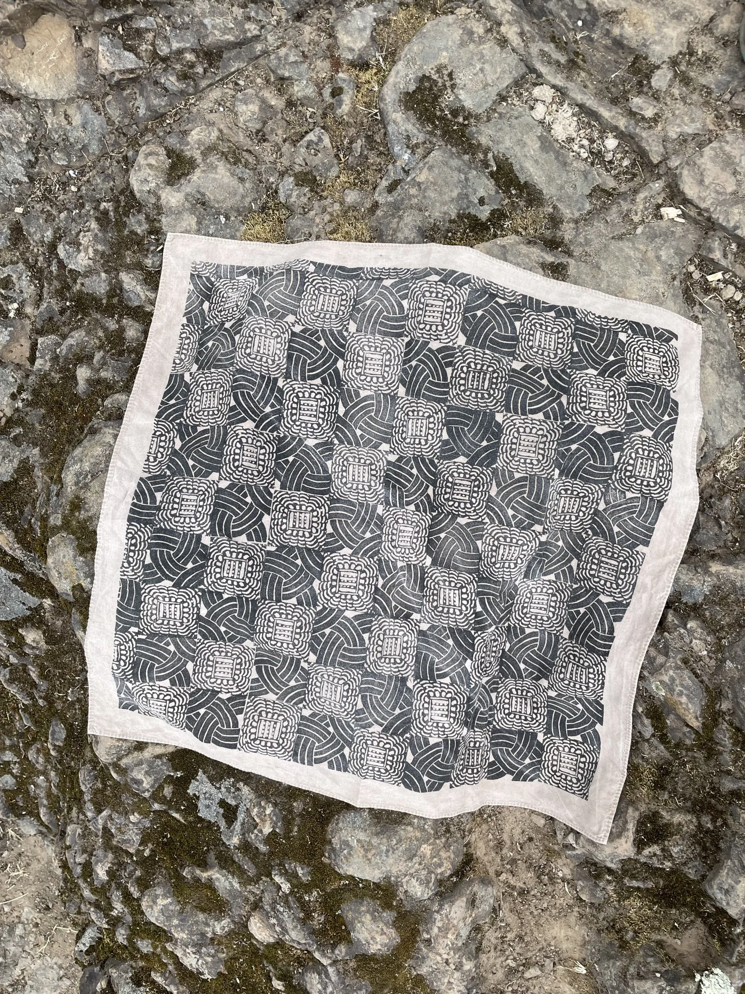 Basket Bandanna100% cotton bandanna dyed with black walnut hulls, and hand printed with an alternating pattern of two hand carved designs, both inspired by basket weaves.